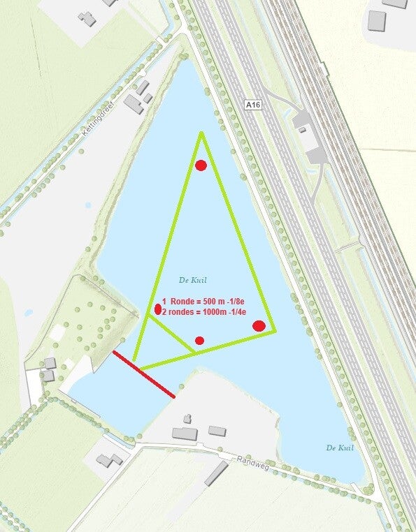 Er wordt een driehoek gezommen linksom. Je zwemt rechts van de boeien.