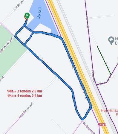 Er worden 2 rondes van ongeveer 2,5 kmof 4 rondes van 2,5 km gelopen met verzorging langs de kant. Bij de eerste ronde loop jje over het terrein van Boomkwekerij Poppelaars. Je loopt NIET over het terrein waar je gaat finishen. Na 2 rondjes houd je links aan, om te finishen. Loop tot over de mat en vergeet vooral niet te lachen. Wie weet wordt je op de foto gezet. :-)